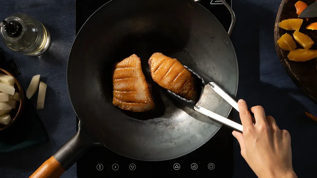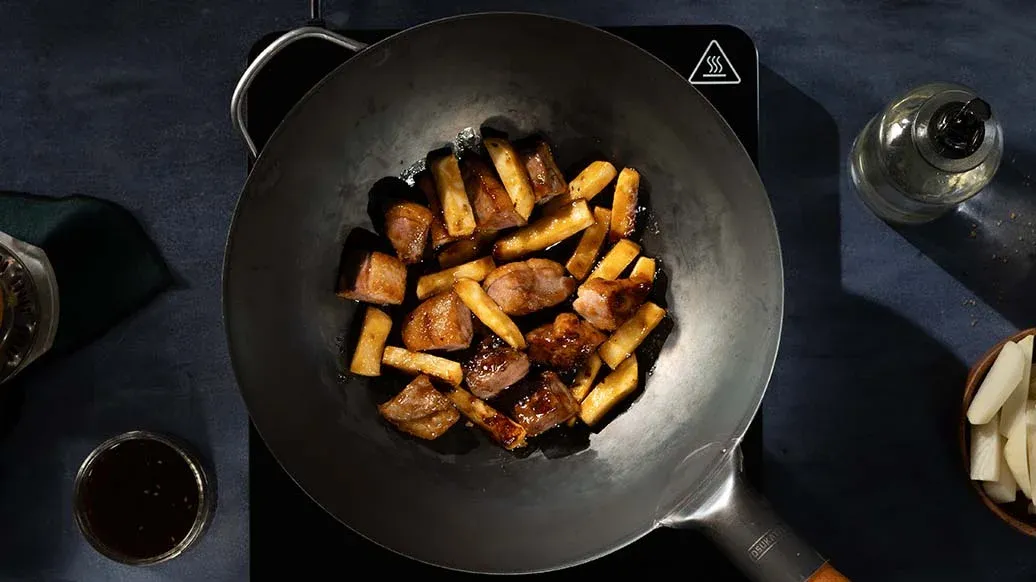 Daikonu sıcak wok’ta 2 dakika soteleyin. Ördek göğsünü boylamasına ikiye kesin, her parçayı 6 dilime bölün; çıkan suları saklayın. Şekeri ve ördek dilimlerini wok’a ekleyin, kısa süre karamelleştirin. Ördek suyu, Kikkoman Teriyaki Sauce with Roasted Garlic ve portakal suyuyla deglaze edin. Yüksek ateşte kısa süre çektirerek ördek ve daikonu glaze edin.