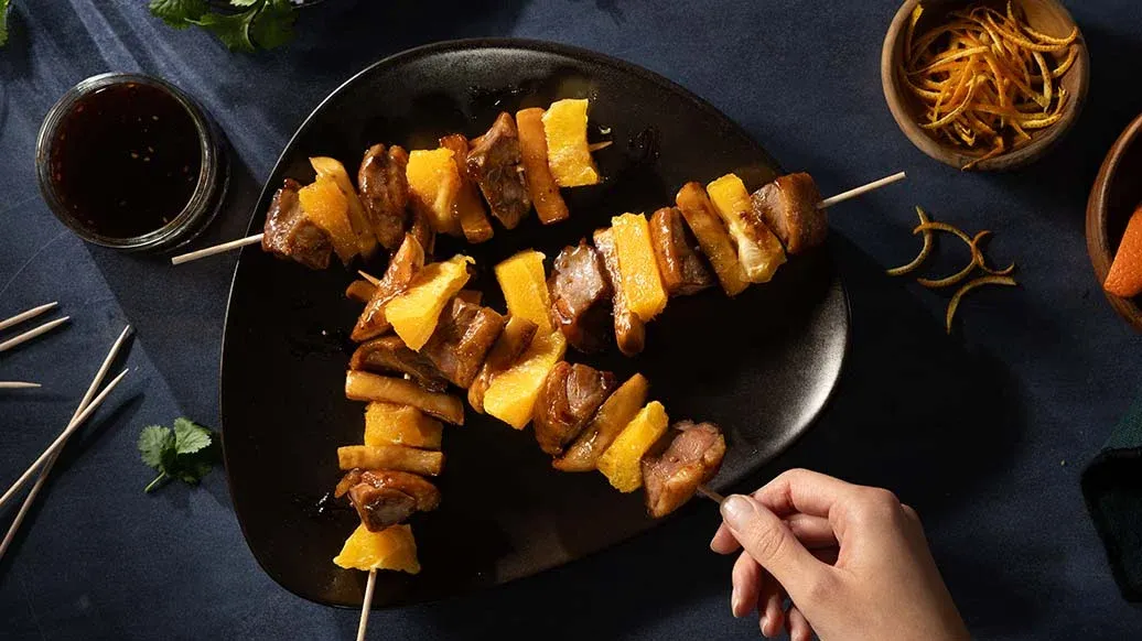 Keyifli buluşmalar için çıtır çıtır ve içi sulu bir atıştırmalık ya da rafine bir Asya-Fransız başlangıcı. Çıtır ördek göğsü ve daikon turpu, Kikkoman Teriyaki Sauce with Roasted Garlic ile glaze edilerek portakalla birleştiriliyor ve küçük zarif şişlere dönüşüyor.