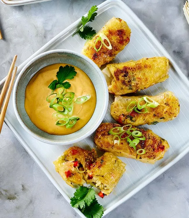 Kıtır pirinç kâğıdı dumpling’leri; ramen, sebzeler ve peynirle dopdolu! Kikkoman Spicy Chili Sauce for Kimchi ve Kikkoman Naturally Brewed Soy Sauce ile lezzeti katlanıyor. Kremsi ve hafif acı dip sosla servis edilen, pratik ve paylaşmalık bir atıştırmalık ya da hafif bir öğün.