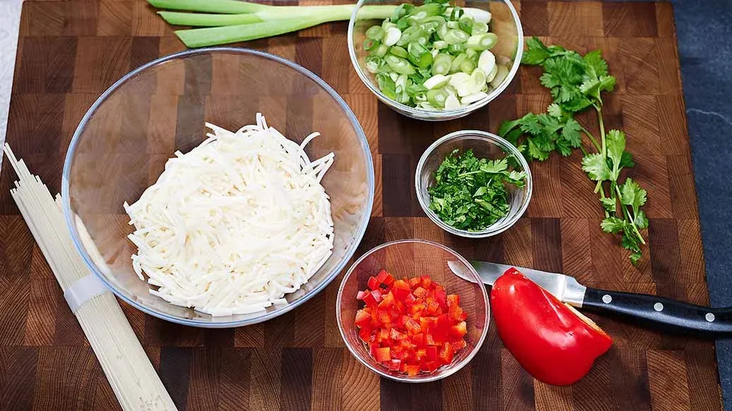 Ramen noodle’ları paket üzerindeki talimatlara göre haşlayın ve küçük parçalara kesin. Taze soğanları ince ince doğrayın. Kişnişi ince ince kıyın. Kırmızı biberi küçük küpler halinde doğrayın.