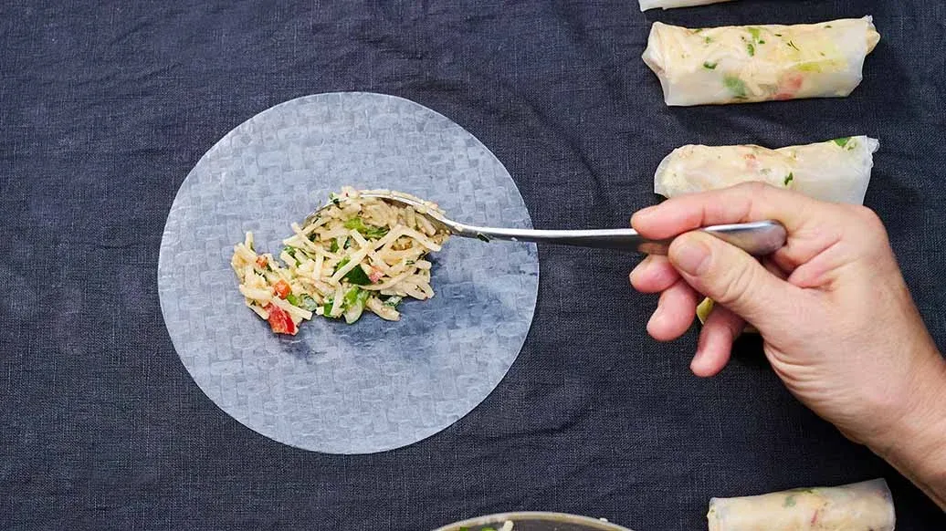 Her pirinç kâğıdını soğuk suya kısa bir süre için batırın ve nemli bir mutfak bezinin üzerine alın. Her birine yaklaşık 1 yemek kaşığı iç harç koyun. Kenarlarını içe katlayıp sıkıca sarın.