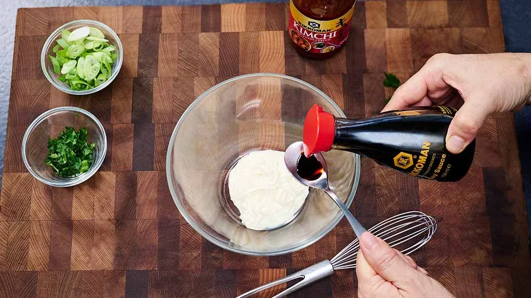 4 ½ yemek kaşığı mayonez – 1 tatlı kaşığı Kikkoman Kimchi Acı Biberli Sosu – 2 tatlı kaşığı Kikkoman Doğal Olarak Fermente Soya Sosu – 1 dal kişniş – 1 adet dilimlenmiş taze soğan