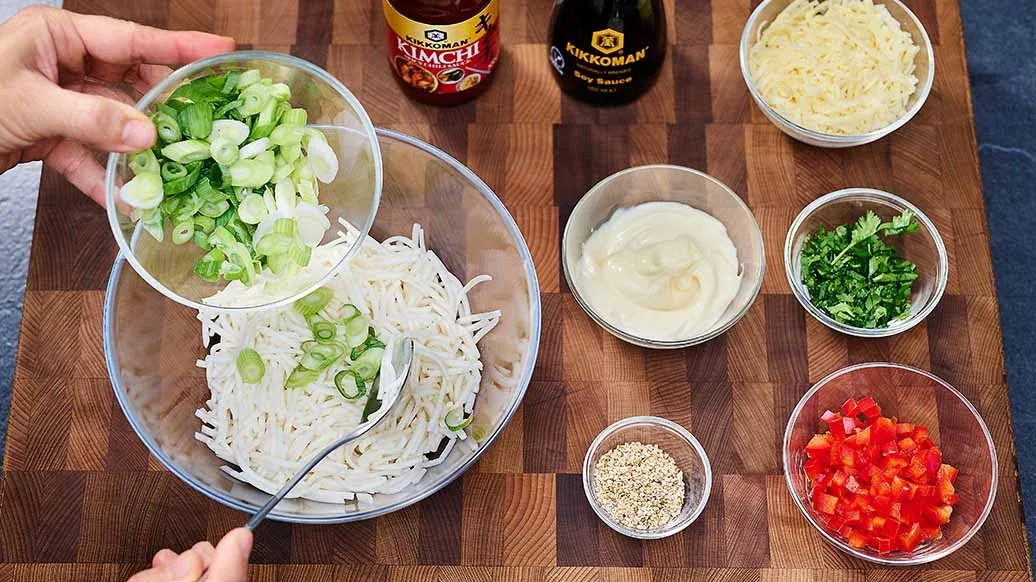 Haşlanan noodle’ları; taze soğanların üçte ikisi, kişniş, kırmızı biber, susam, Kikkoman Spicy Chili Sauce for Kimchi, mayonez, peynir ve Kikkoman Naturally Brewed Soy Sauce ile karıştırın.