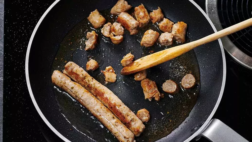 Sosisler kesilir, sosis eti çıkarılır ve derisi atılır. Kenarları yüksek olan büyük bir tavada, yağ iyice kızdırılır. Sosisler 8-10 dakika kızartılır ve bir tahta kaşığın arkasıyla küçük parçalara ayrılır. Sosis eti altın kahverengi olana kadar kızardıktan sonra, bir tabağa alınarak kenarda bekletilir.