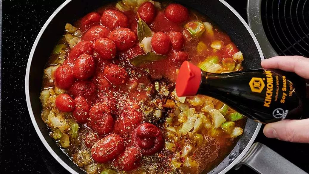 Soğan ve rezene tavaya eklenir ve yumuşayana kadar 10 dakika pişirilir. Sarımsak eklenir ve bir dakika daha pişirilir, daha sonra konserve domates, 200 ml su, pul biber, kekik, defne yaprağı, salça ve soya sosu ilave edilir. Düşük ateşte 20 dakika sos hafif koyulaşana kadar pişirilir ve isteğe göre baharat eklenir.