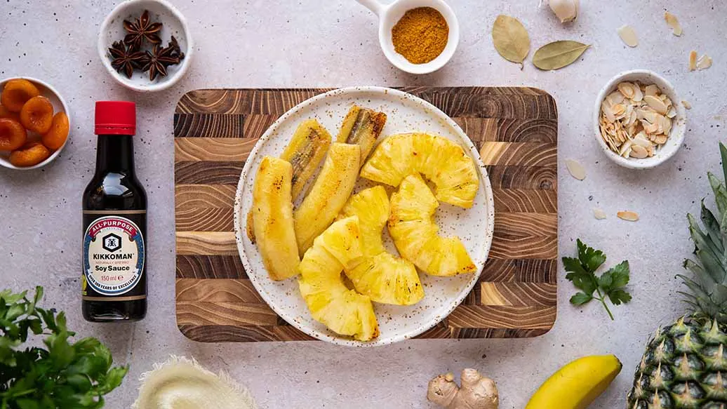 Muzu önce enine ikiye, ardından boyuna kesin. Ananasın kabuğunu soyun, ortadaki sert kısmını çıkarın ve yaklaşık 1,5 cm kalınlığında halkalar şeklinde dilimleyin. Ananas halkalarını ortadan ikiye kesin. Tereyağını tavada eritin, meyveleri her iki yüzü hafifçe kızarana kadar kısa süre pişirin. Tavadan alıp sıcak tutun.