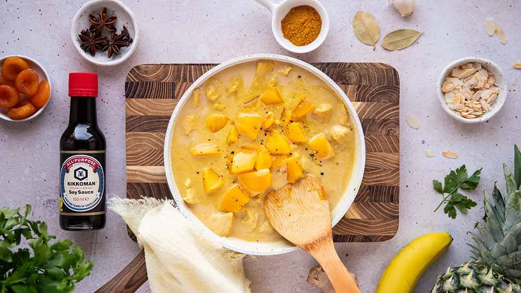 Kanola yağında arpacık soğan ve zencefili soteleyin. Tavuk göğsü ve köri tozunu ekleyip tavuk tamamen pişene kadar kavurun, ardından tavuktan ayrı bir tabağa alın. Aynı tavada tereyağını eritin, unu ekleyip kısa süre karıştırın. Tavuk suyu, krema, şeftali suyu ve Kikkoman Naturally Brewed Soy Sauce’u ekleyin. Sos koyulaşana kadar kısık ateşte pişirin. Karabiberle tatlandırın. Tavuk ve şeftaliyi ekleyip ısıtın. Pilav ve kızarmış meyvelerle birlikte servis edin. Üzerine kavrulmuş badem yaprakları ve maydanoz serpin.