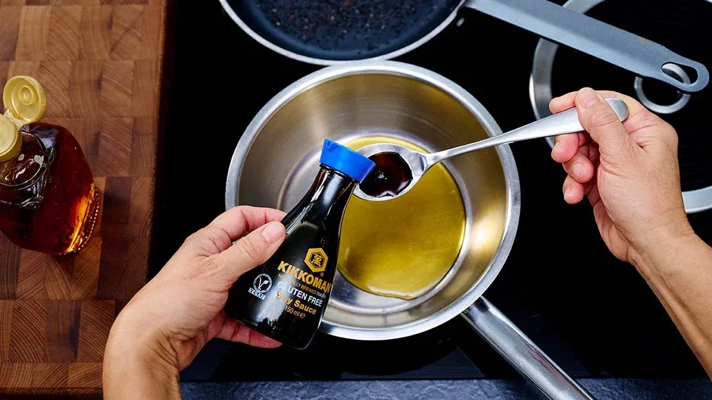 Akçaağaç şurubu ile Kikkoman Gluten free Soy Sauce’u karıştırın. Gerekirse çok az ısıtın.