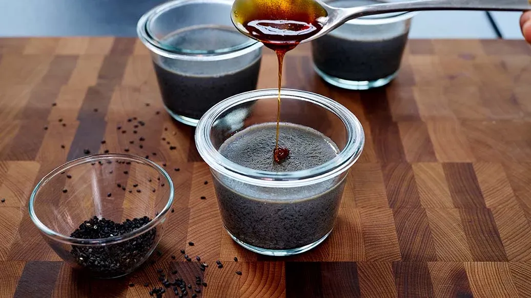 Kremsi, tatlı ve ferahlatıcı bu vegan panna cotta, rengini siyah tahinden alıyor. Vanilyalı soya sütünün yumuşak dokusu, tamari ile hazırlanan şurupla birleşince, tatlıya ince bir umami derinliği kazandırıyor.