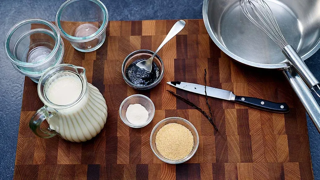 1 vanilya çubuğu – 600 ml soya sütü – 50 gr esmer şeker (veya 4 yemek kaşığı akçaağaç şurubu) – 2 yemek kaşığı siyah tahin (kavanozdan) – 1 ½ tatlı kaşığı agar agar (ipuçlarına bakınız)