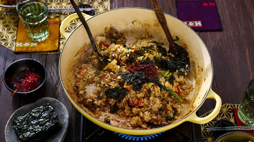 Bir tavada Kikkoman Toasted Sesame Oil’i ısıtın. Pişmiş pirinci ve Kikkoman Teriyaki Sauce with Toasted Sesame’i ekleyin. Pirinç tamamen ısınana kadar karıştırarak kavurun. Güveçle birlikte servis edin.
