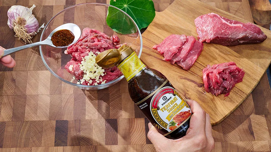 300 gr ince dilimlenmiş dana veya domuz eti (Kıyma veya tofu da kullanılabilir) – 1 diş rendelenmiş sarımsak – 120 ml Kikkoman Kavrulmuş Susamlı Teriyaki Sos
