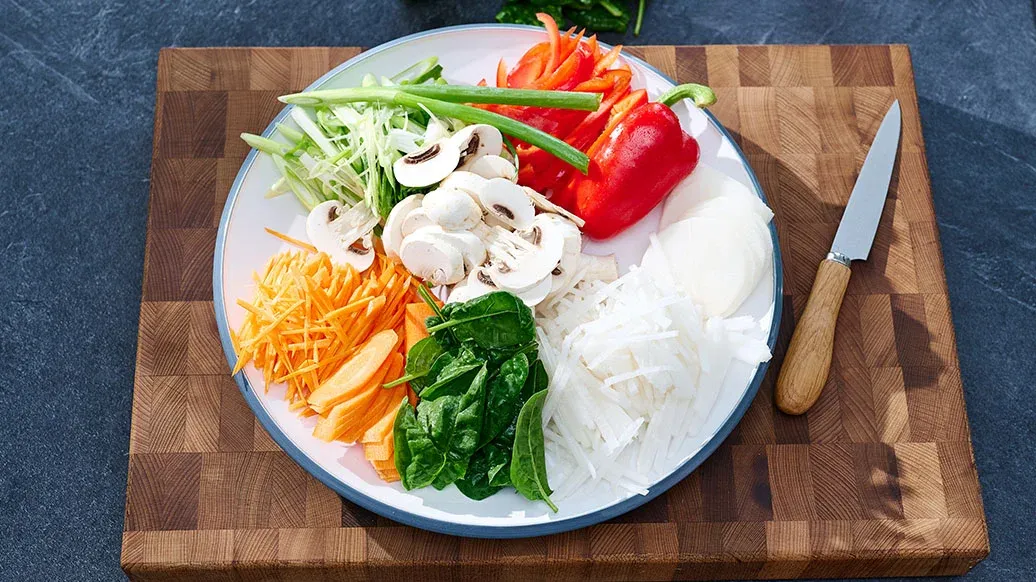 Daikon turpu ve havucu 6 cm uzunluğunda ince şeritler halinde doğrayın. Taze soğan, ıspanak ve kırmızı biberi 6 cm uzunluğunda kesin. Mantarları 5 mm kalınlığında dilimleyin.