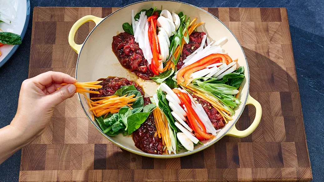 Kikkoman Toasted Sesame Oil’i bir tencereye alın. İlk adımdaki marine edilmiş eti 5 porsiyona ayırın ve tencereye dairesel şekilde yerleştirin, aralarda boşluk bırakın. 2. adımdaki sebzeleri etin çevresine eşit biçimde dizin.
