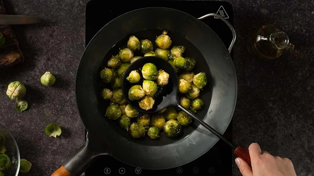 Yağı geniş bir wok’ta ısıtın. Bir lahana yaprağı yağa değdiğinde anında kabarıyorsa yağ yeterince sıcaktır (yaklaşık 175°C). Brüksel lahanalarını iki parti hâlinde, her seferinde yaklaşık 4 dakika dışı çıtır içi yumuşak olana kadar kızartın. Çıkarıp iyice süzdürün.