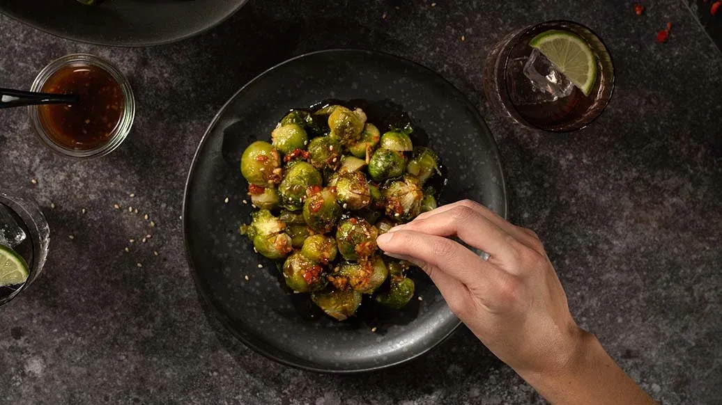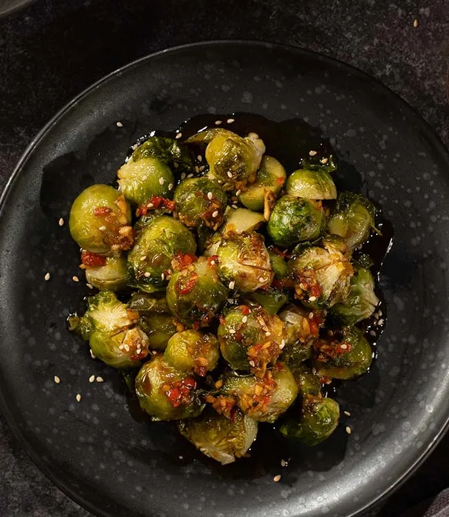 Fırında pişerek çıtırlaşmış Brüksel lahanaları, yoğun aromalı kavrulmuş sarımsak aromalı teriyaki sosu ve bol susamla birleşiyor. Hem pratik hem de kış sofralarına çok yakışan, hazırlaması kolay bir salata.