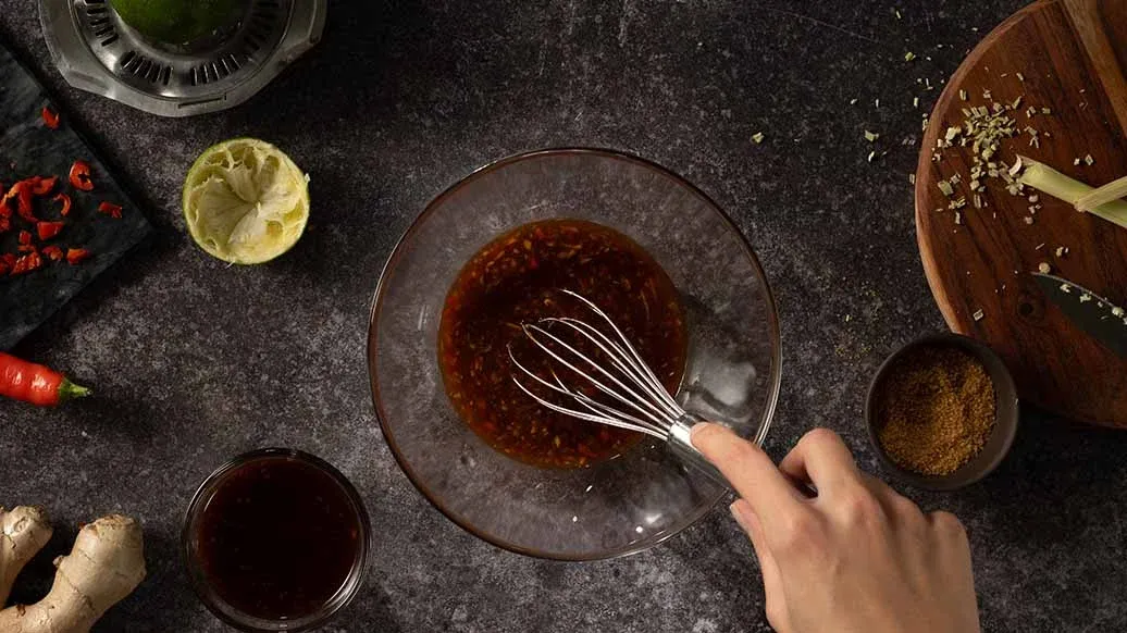 2 adet yeşil limon – 3 yemek kaşığı sebze suyu – 1 adet kırmızı acı biber, doğranmış – 10 gr zencefil ya da zencefil kökü, doğranmış – 1 adet küçük limonotu sapı (çok ince doğranmış) – 1 yemek kaşığı esmer kamış şekeri (alternatif: palmiye şekeri) – 4 yemek kaşığı Kikkoman Kavrulmuş Sarımsaklı Teriyaki Wok Sosu – 2 yemek kaşığı Kikkoman Doğal Olarak Fermente Soya Sosu