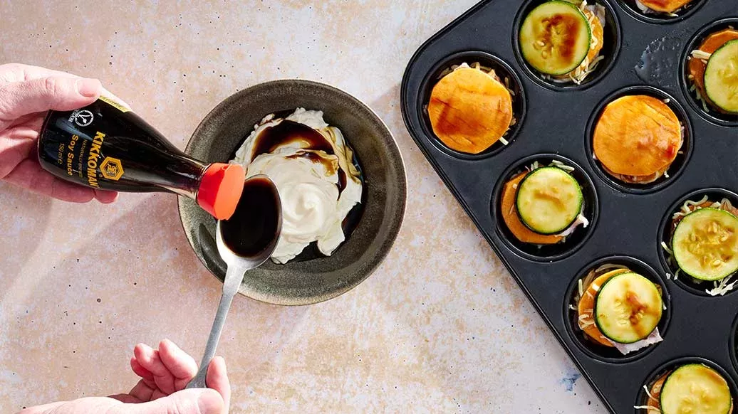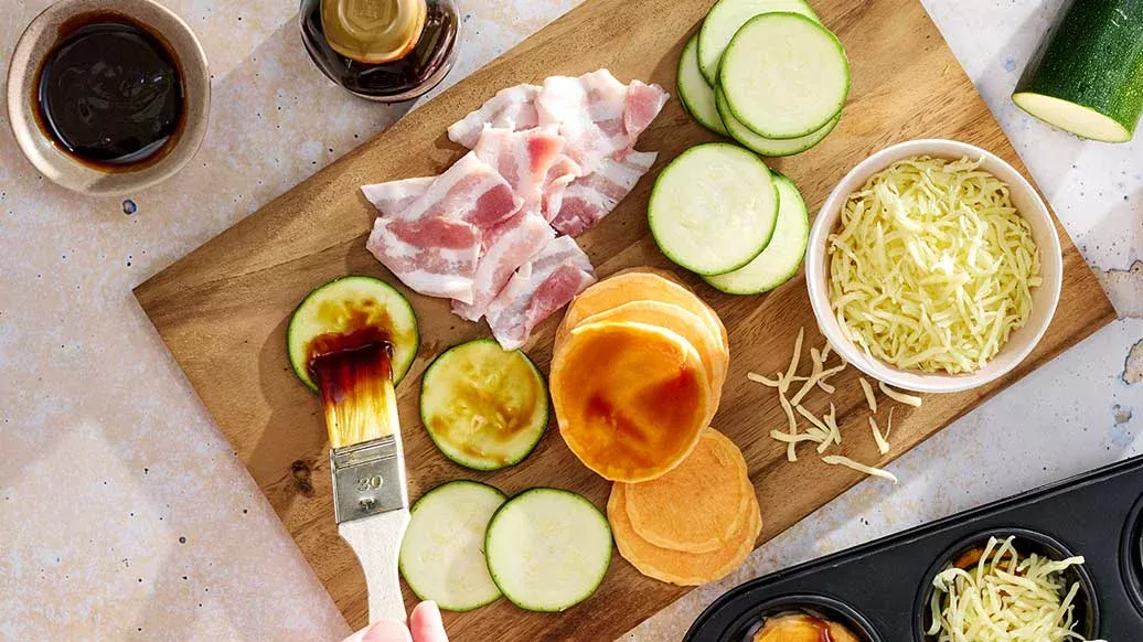 Fırını önceden 180 °C'ye ısıtın ve muffin kalıbını sıvı bitkisel yağla yağlayın. Tatlı patatesleri soyun ve sakız kabağıyla birlikte ince ince dilimleyin. Kikkoman Teriyaki BBQ-Sauce Honey ile kaplayın. Pastırmayı parçalara ayırın. Tatlı patatesleri, kabakları, pastırmayı ve Gouda'yı dönüşümlü olarak muffin kalıbına yerleştirin ve yaklaşık 25 dakika pişirin.