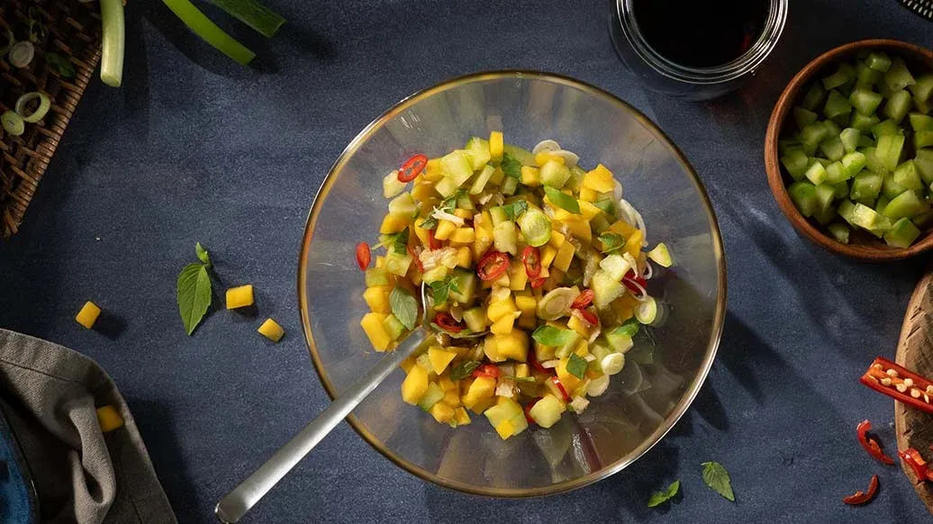 Yeşil limon ve kaffir yeşil limon yapraklarını mango, salatalık, zencefil, acı biber, taze soğan, Tay fesleğeni ve Kikkoman Ponzu – Lemon ile karıştırın.