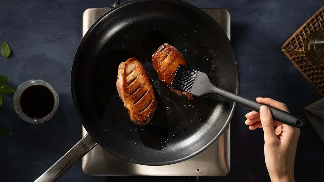 Ördek göğsünün derisini boyuna ve enine 5 mm’lik aralıklarla çizin. Tavada veya ızgarada, derisi aşağıda olacak şekilde orta ateşte 12 dakika pişirin. Deri altın rengi ve çıtır olmalıdır. Kikkoman Teriyaki BBQ Sauce in Korean Style ile fırçalayın. Çevirin ve tekrar fırçalayarak 4 dakika daha pişirin. Bir kâseye alıp dinlendirin.