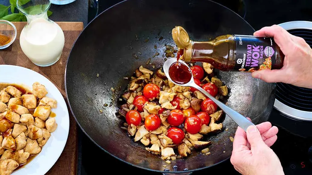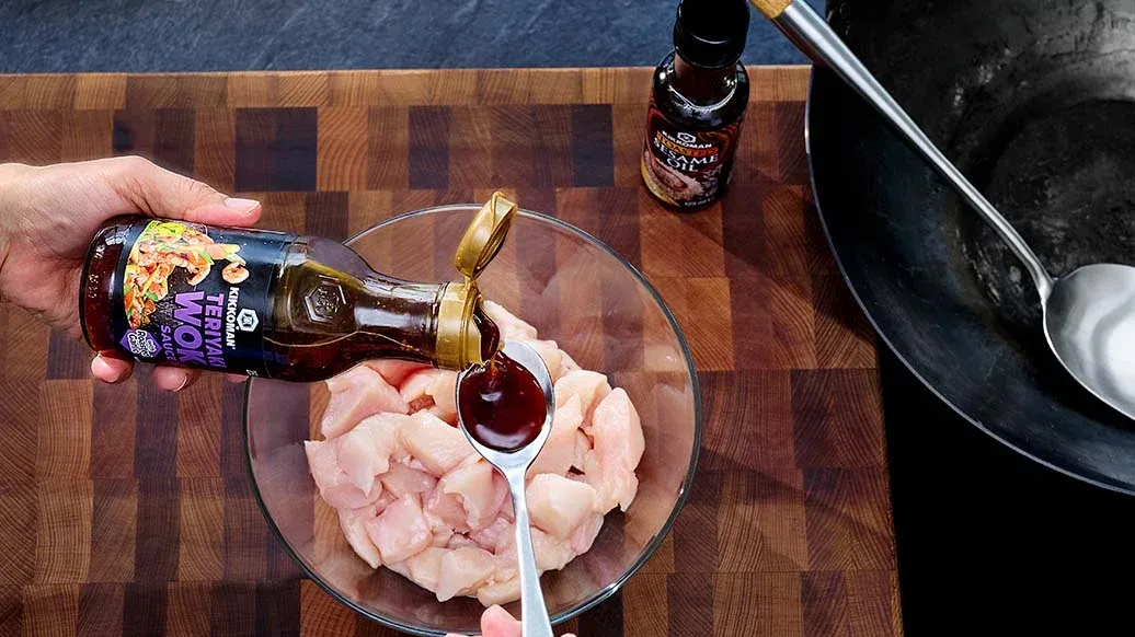 Tavuk göğsünü küp küp veya şeritler halinde doğrayın. Kikkoman Teriyaki Wok Sauce with Roasted Garlic ile yaklaşık 5 dakika marine edin. Wok’ta Kikkoman Toasted Sesame Oil’i ısıtın, tavukları 8 dakika kadar pişirip alın.