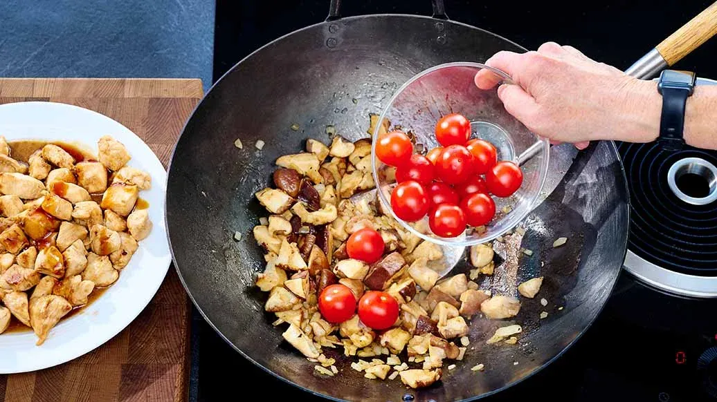 Sosu hazırlamak için wok’ta tereyağını ısıtın. Mantarları yaklaşık 2 cm’lik parçalar halinde doğrayın. Soğanı küp, sarımsağı ince ince doğrayın. Tereyağında soğan, sarımsak ve mantarı 5 dakika soteleyin. Şeri domatesleri ekleyip 3 dakika daha pişirin.