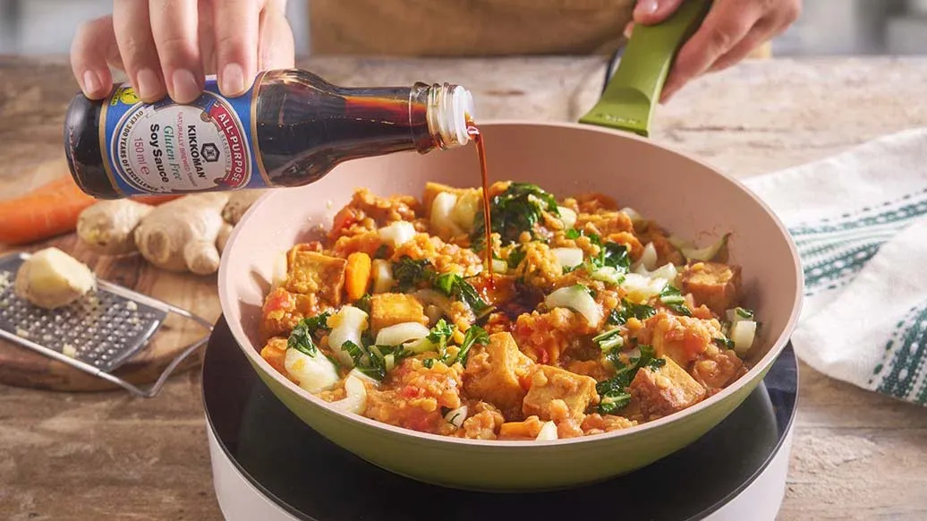 Aynı tavaya pak choi ekleyin ve 1-2 dakika kavurun. Garam masala ekleyip 10-15 saniye kokusunu çıkarmak için kavurun. Pişmiş mercimeği ekleyip karıştırın. Ardından konserve domatesi ekleyin ve 3 dakika daha pişirin. Kikkoman Gluten Free Soy Sauce ve Kikkoman Sesame Oil ile tatlandırın.
