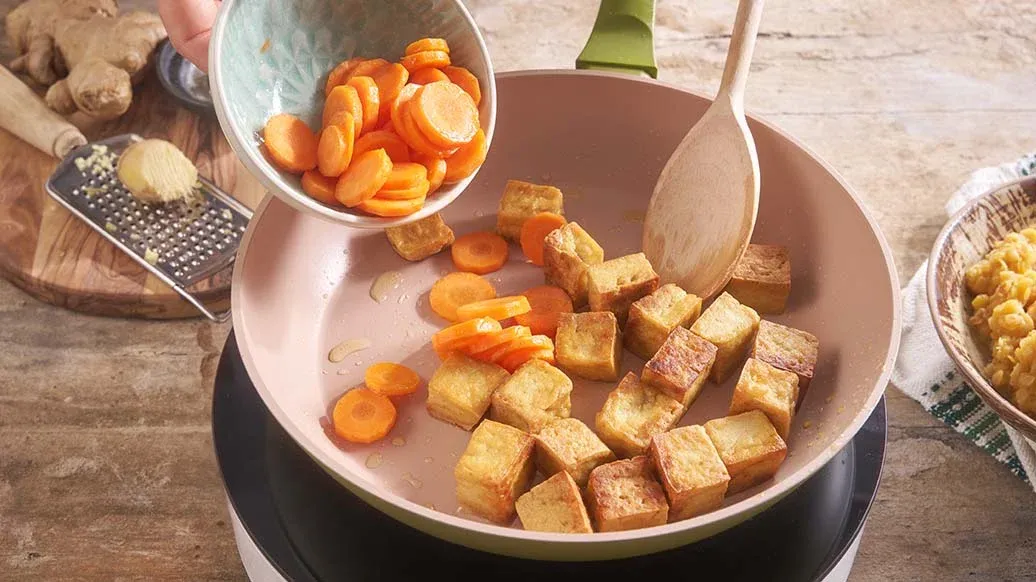 Mercimeği sebze suyunda 10 dakika pişirin. Ayrı bir tavada tofuyu sade yağda 4-5 dakika çıtır olana kadar kızartın. Havuç ve zencefili ekleyin, 2 dakika kavurun.