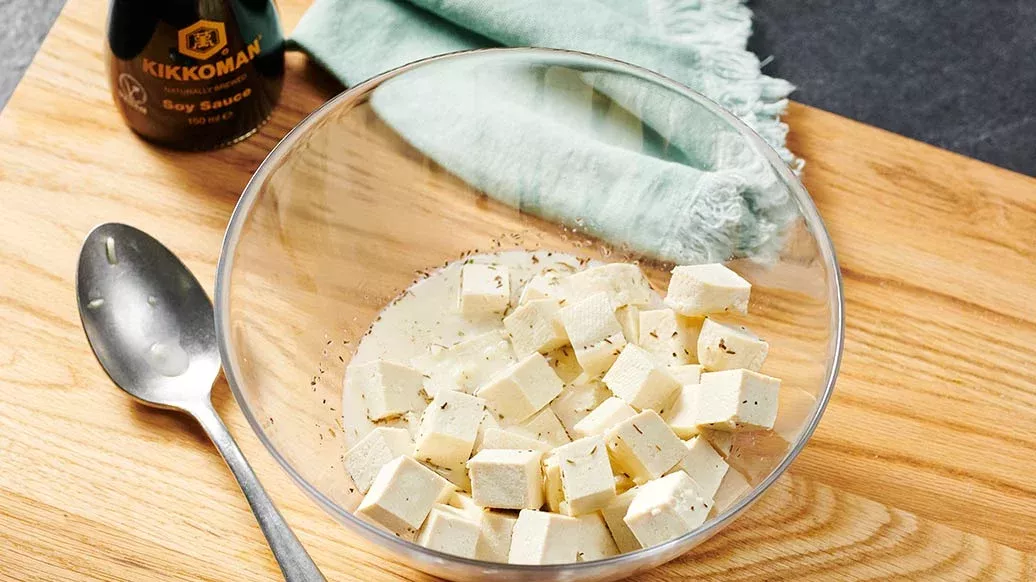 Vegan peynir yerine tütsülenmiş Tofu'yu biraz Kikkoman soya sosuyla marine edebilirsiniz.