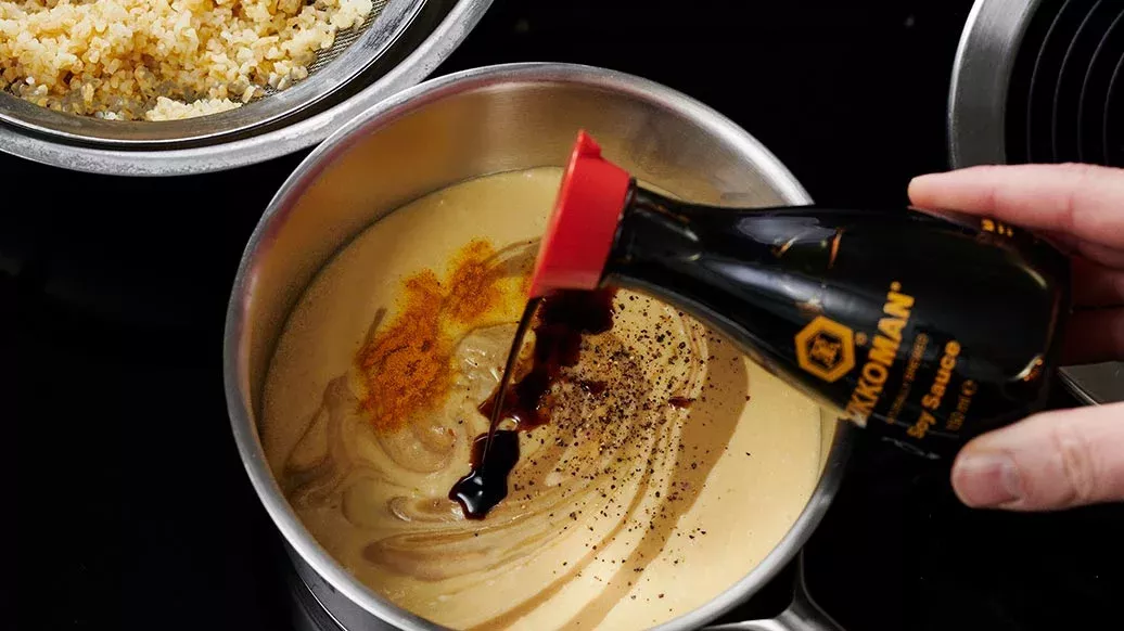 Sosu için 150 gr nohudu biraz misket limonu kabuğu, biraz misket limonu suyu ve Hindistan cevizi sütüyle lezzetlendirerek püre haline getirin. Isıtın, ardından tahin, Kikkoman Soya Sosu, karabiber ve zerdeçalı ekleyin.