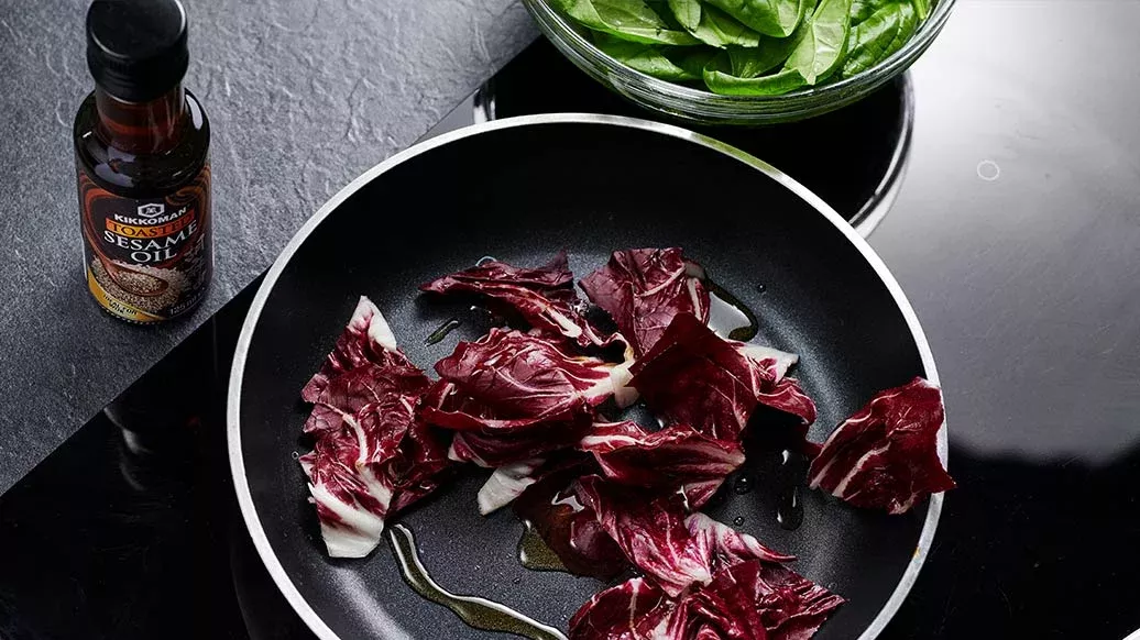 Bulguru ambalajındaki talimatlara göre hazırlayın. Pazıyı şeritler halinde doğrayın ve ısıttığınız 1 tatlı kaşığı Kikkoman Susam Yağı soteleyin. Aynı işlemi ıspanakla tekrarlayın.