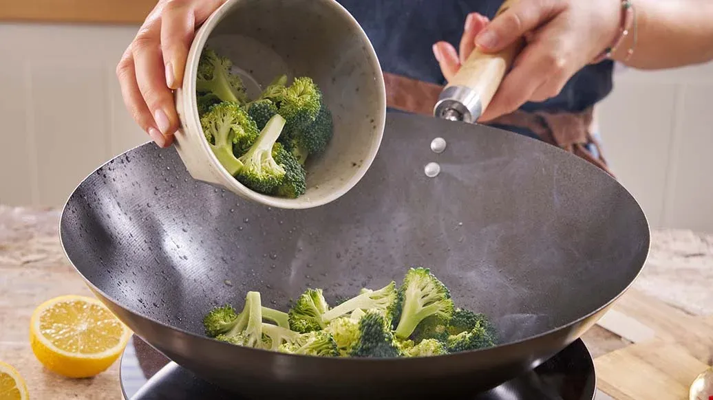 Aynı wok tavaya biraz daha yağ ekleyin. Sarımsak ve brokoliyi 1-2 dakika soteleyin. Suyu ekleyin, orta ateşte buharlaşana kadar pişirin. Brokoli yumuşayınca kırmızı biberi ekleyin. 2-3 dakika daha pişirin.