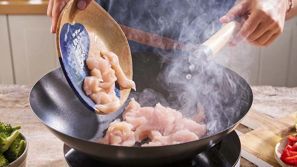 Wok tavayı ısıtın. Yağı ekleyin, ardından tavukları ilave edin. 3-4 dakika, altın rengini alana kadar soteleyin. Tavuktan çıkan sıvı azalınca alın ve kenara koyun.
