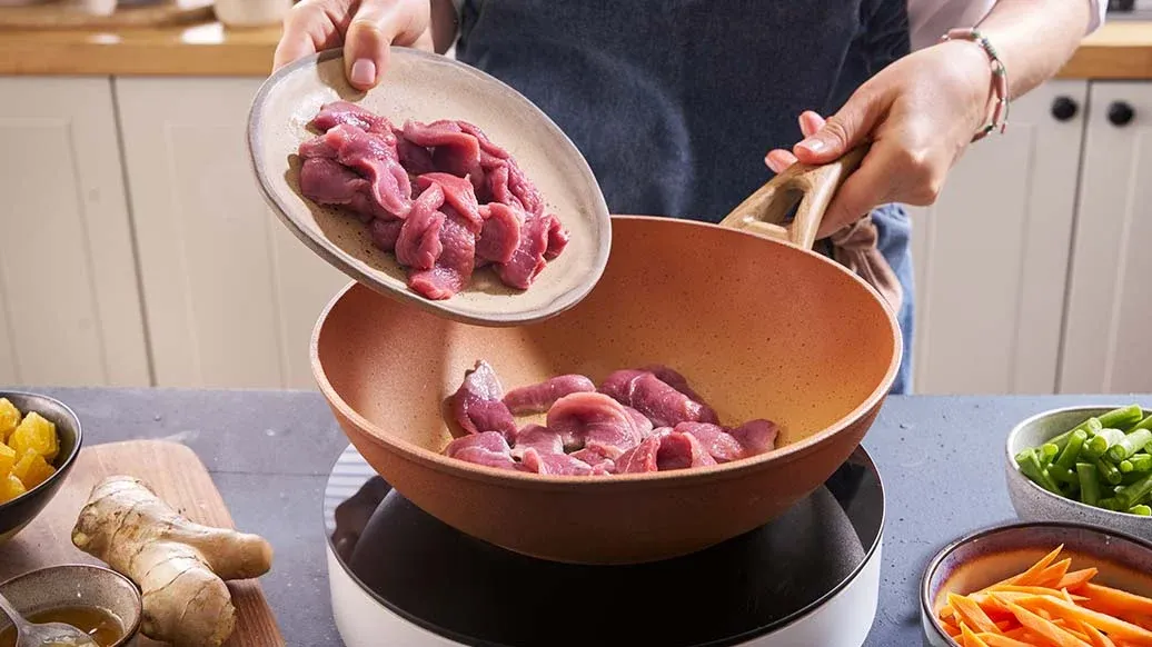 Wok tavada yağı ısıtın. Ördek dilimlerini ekleyin, 2-3 dakika kadar soteleyin. Hafifçe renk alınca tavadan çıkarın ve kenara alın.