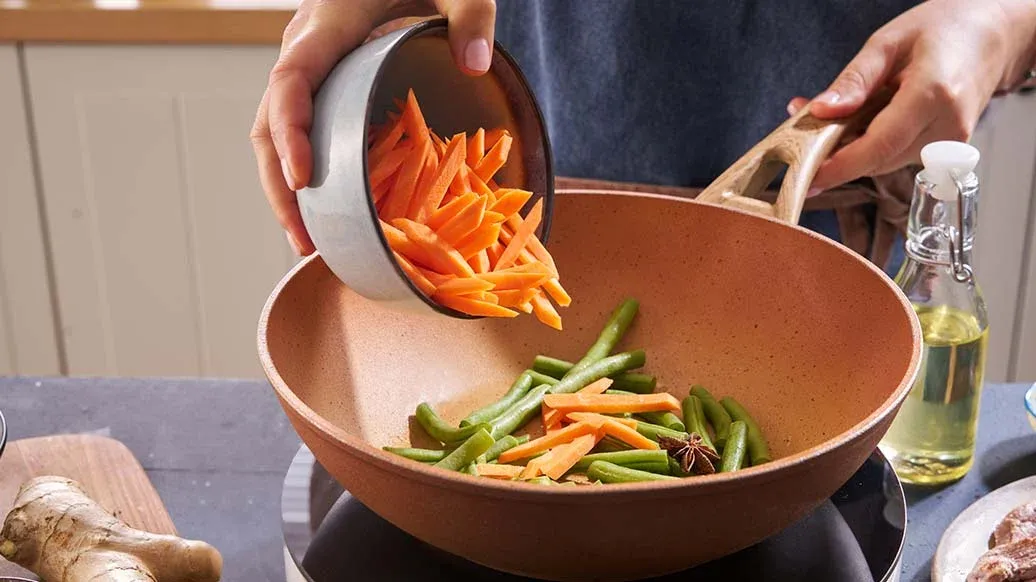 Aynı wok’a biraz daha yağ ekleyin. Zencefil, havuç, yeşil fasulye ve yıldız anasonu ekleyin. 2-3 dakika soteleyin. Suyu ilave edin, yaklaşık 2 dakika kısık ateşte pişirin. Fasulyeler hafif yumuşayınca ocaktan alın.