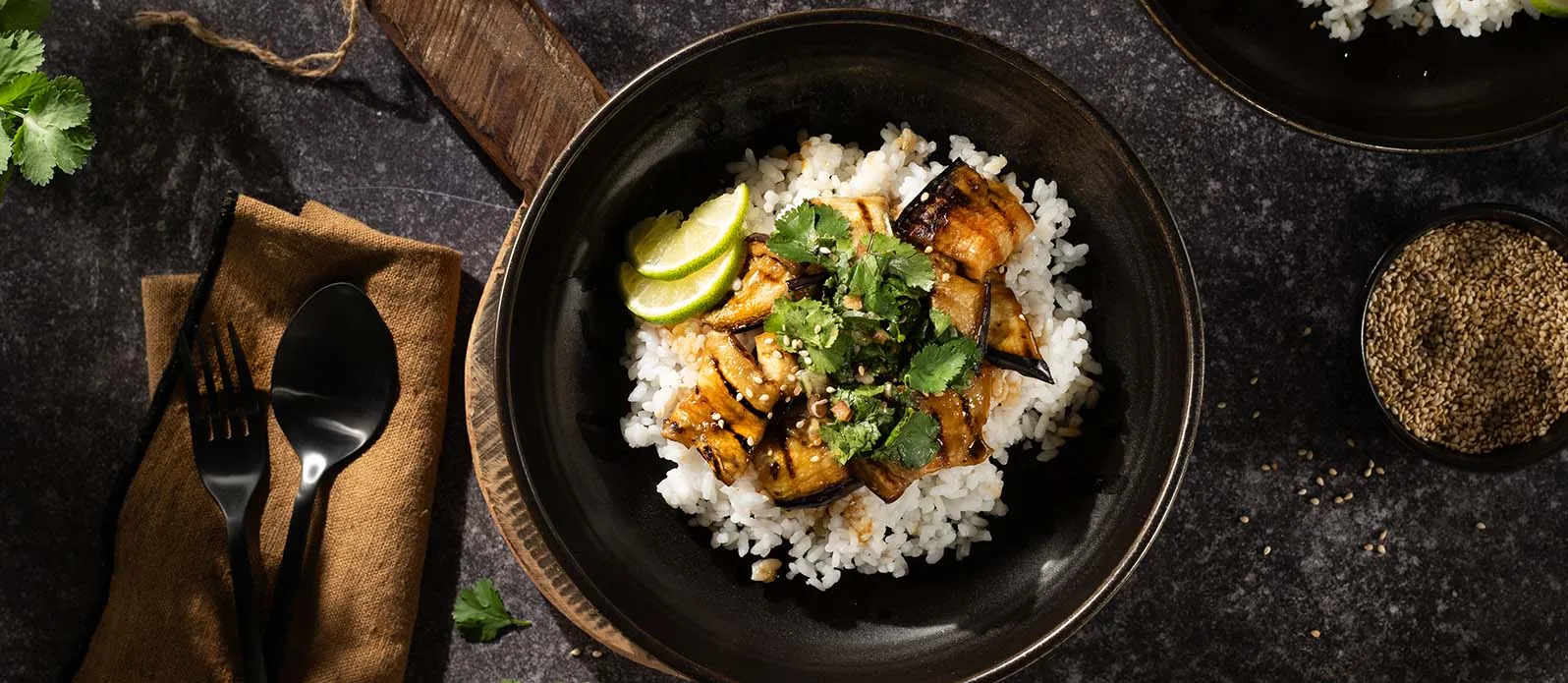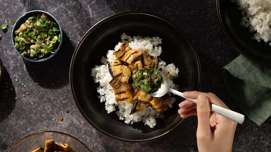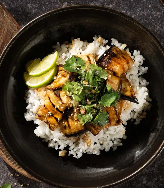Izgara teriyaki patlıcan, chirashi sushi tarzı bir kâsede yeşil limonlu salsayla buluşuyor. Hafif, vegan ve ferah bir öğün. Hızlı bir öğle yemeği için ideal. Sushi ve sashimi tabağının parçası olarak da harika bir seçenek.