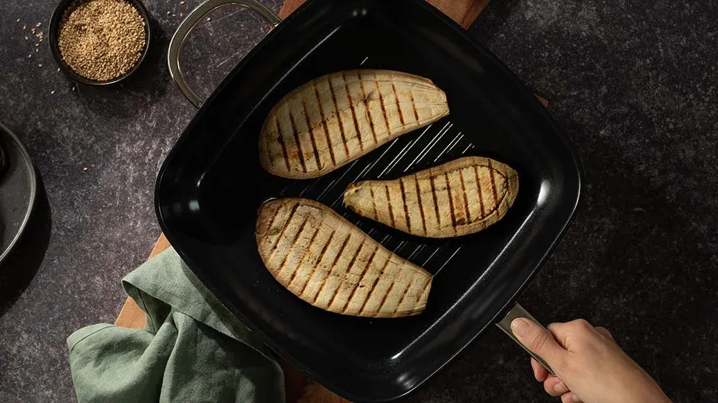 Patlıcanı uzunlamasına, 1 cm’den biraz ince olacak şekilde dilimleyin. Az yağlanmış ızgara, grill tava veya yapışmaz tavada 8-10 dakika pişirin. Üzerine hafif bir ağırlık (örneğin tencere kapağı) koymak daha iyi sonuç verecektir. Susamı küçük bir kuru tavada sık sık karıştırarak altın rengini alana kadar kavurun.