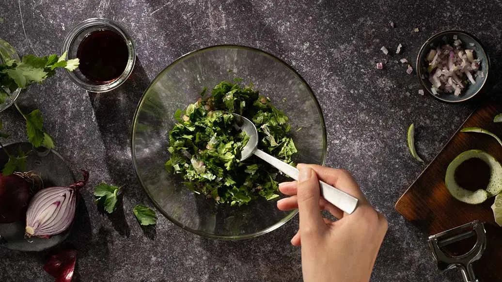 Önce salsa hazırlayın. Yeşil limonu soyun ve etli kısmını küçük küpler hâlinde kesin. Soğan, kişniş ve Kikkoman Yuzu Ponzu ile karıştırın.
