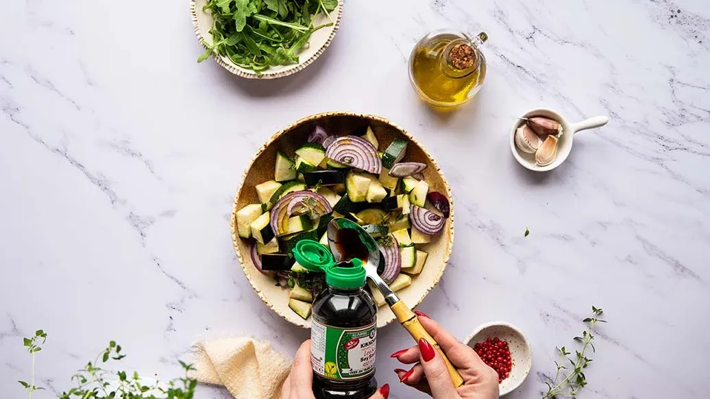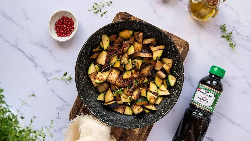 Patlıcan ve kabağı küp küp doğrayın, soğanı dilimleyin. Sebzeleri bir kâseye alın. Zeytinyağı, Kikkoman Less Salt Soy Sauce ve kekikle harmanlayın. 200°C'de 15 dakika közleyin.