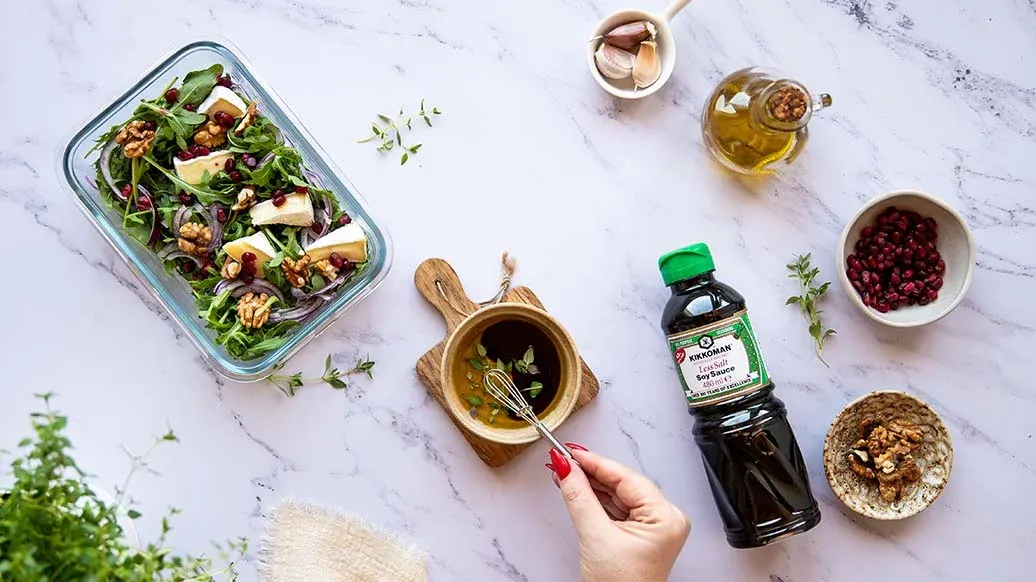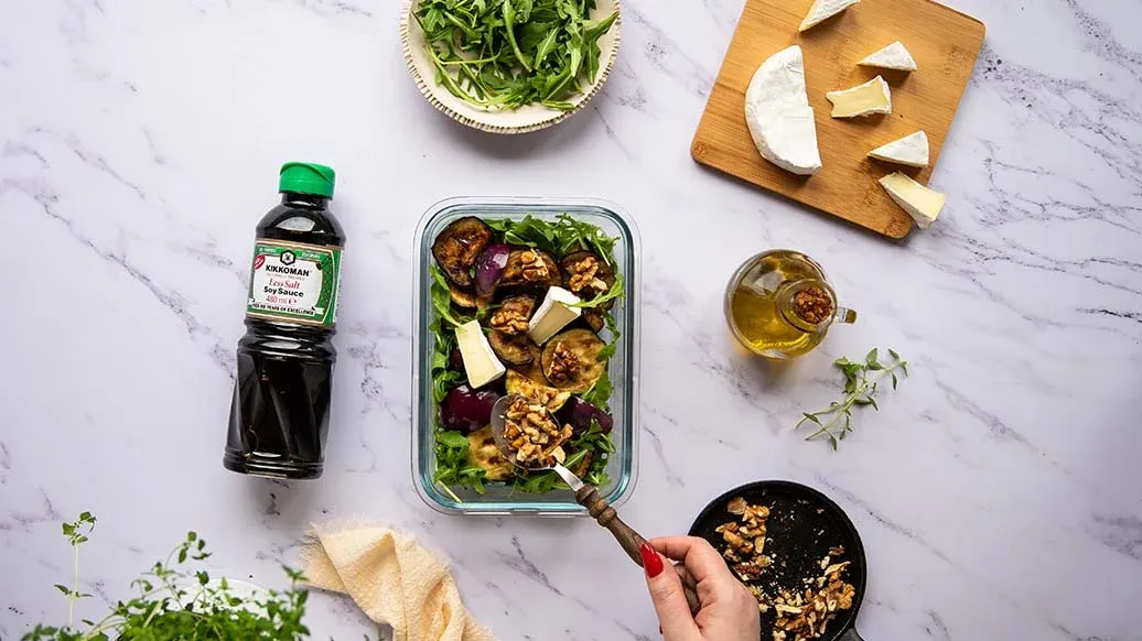 Roka, camembert, soğan, ceviz ve nar tanelerini beslenme kutusuna yerleştirin. Zeytinyağını Kikkoman Less Salt Soy Sauce, bal ve kekikle çırpın. Salata üzerine gezdirin. Patlıcan köftesi ile servis yapın.
