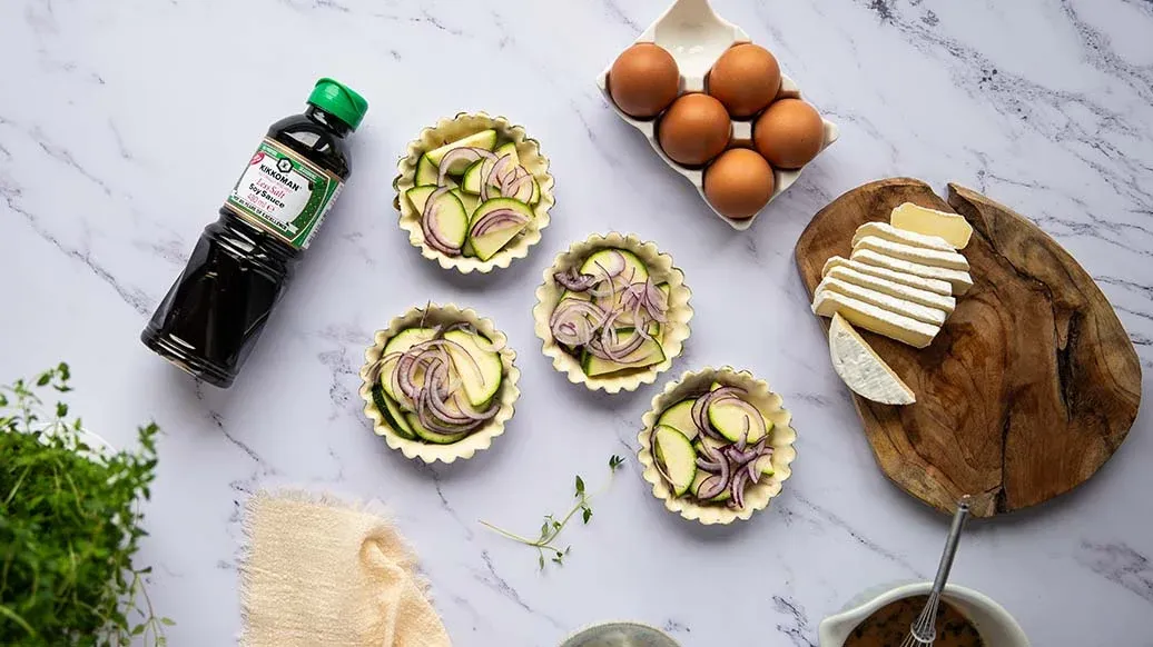Camembert'i dilimleyin ve bir kenara ayırın. Patlıcan ve kabağı küp küp doğrayın, soğanı dilimleyin. 1 yemek kaşığı zeytinyağını ısıtın, sebzeleri sote edin. Ardından Kikkoman Less Salt Soy Sauce, kekik ve biberi ekleyin.