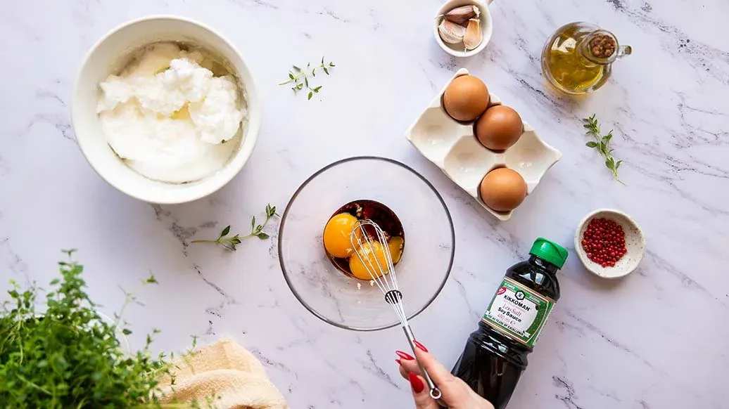 Yumurtaları yoğurt, Kikkoman Less Salt Sauce, sriracha ve kekikle çırpın.