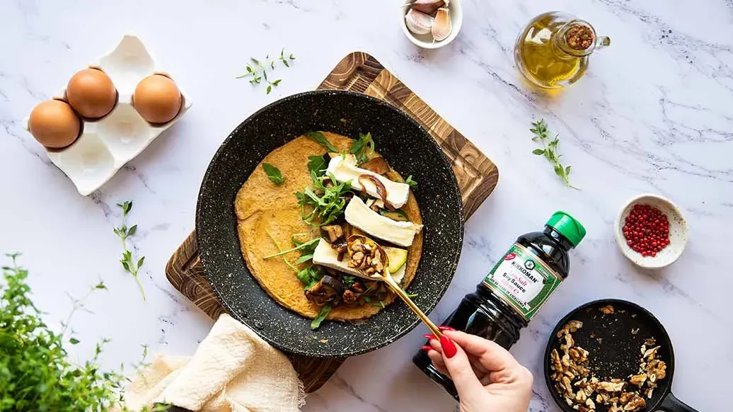 Yumurtaların beyazlarını sarılarından ayırın. Beyazları köpük köpük olup sertleşene kadar çırpın. Sarıları Kikkoman Less Salt Soy Sauce, sriracha ve sarımsakla karıştırın, sonra beyazları nazikçe karıştırıp katlayın. Tavada ½ yemek kaşığı zeytinyağını ısıtın, karışımın yarısını dökün ve kısık ateşte kapalı olarak her iki tarafını ikişer dakika pişirin. İkinci omlet için işlemi tekrarlayın.