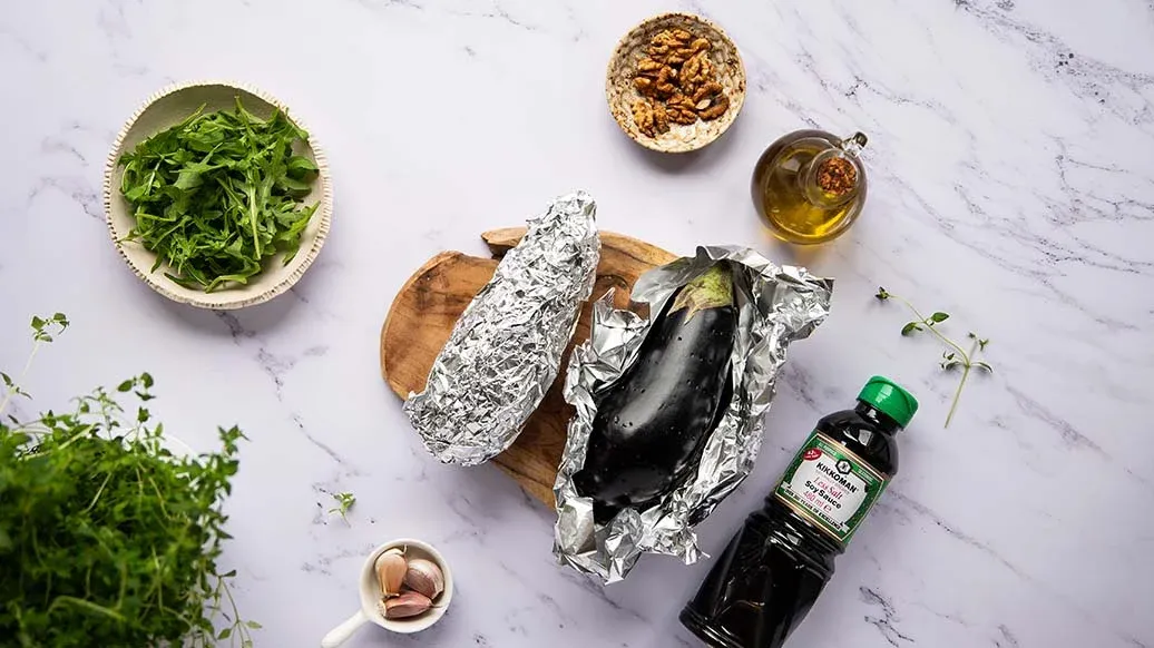 100 gr patlıcan – 100 gr kabak – 40 gr ince doğranmış kırmızı soğan – 1 yemek kaşığı zeytinyağı – 1 yemek kaşığı Kikkoman Daha Az Tuzlu Doğal Olarak Fermente Soya Sosu – 1 tatlı kaşığı doğranmış taze kekik