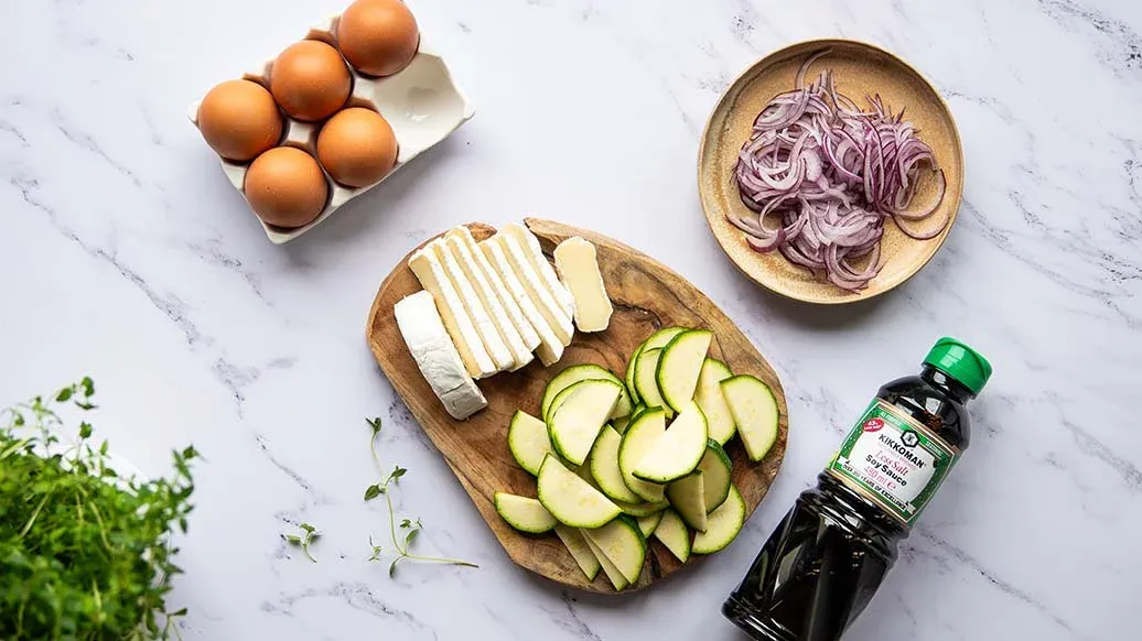 100 gr camembert – 100 gr patlıcan – 100 gr kabak – 50 gr kırmızı soğan – 1 yemek kaşığı zeytinyağı – 1 yemek kaşığı Kikkoman Daha Az Tuzlu Doğal Olarak Fermente Soya Sosu – 1 tatlı kaşığı doğranmış taze kekik – 0,25 tatlı kaşığı pembe biber