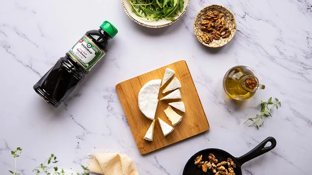 4 avuç roka – 80 gr camembert – 50 gr ince doğranmış kırmızı soğan – 30 gr ceviz – 2 yemek kaşığı nar tanesi – 2 yemek kaşığı zeytinyağı – 1 yemek kaşığı Kikkoman Daha Az Tuzlu Doğal Olarak Fermente Soya Sosu – 2 tatlı kaşığı bal – 1 tatlı kaşığı doğranmış taze kekik