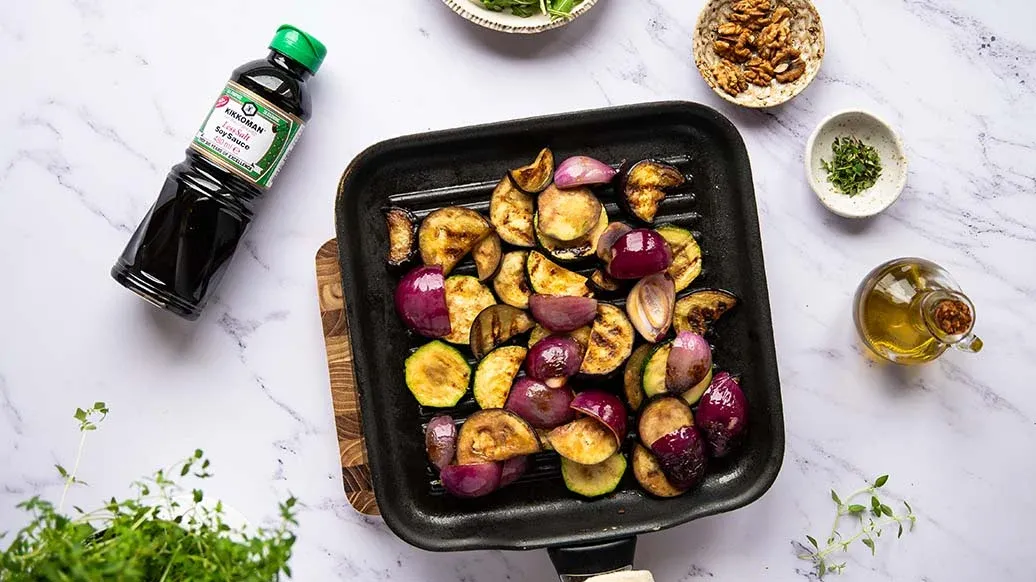 Kabağı dilimleyin, patlıcanı yarım ay şeklinde kesin ve kırmızı soğanı katlarına ayırın. Sebzeleri zeytinyağı, Kikkoman Naturally Brewed Less Salt Soy Sauce, sarımsak ve kekikle karıştırın. Izgara tavasında her iki tarafını 5'er dakika pişirin, ardından soğumaya bırakın.