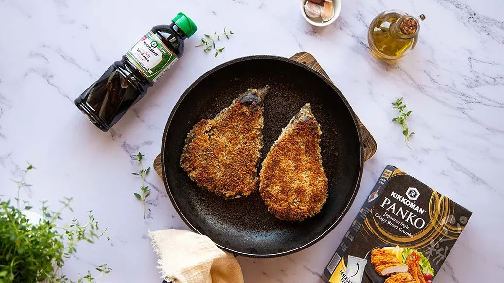 2 yumurta – 2 yemek kaşığı Kikkoman Daha Az Tuzlu Doğal Olarak Fermente Soya Sosu – 3 tatlı kaşığı sriracha – 1 diş ince doğranmış sarımsak – 40 gr Kikkoman Panko - Japon Usulü Çıtır Ekmek Kırıntısı – 75 ml zeytinyağı