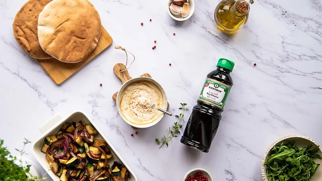 Yoğurdu Kikkoman Less Salt Soy Sauce, sarımsak, bal ve pembe biberle karıştırın. Karışımı pita ekmeklerinin içine sürün. Ardından roka, közlenmiş sebzeler ve panelenmiş camembert ile doldurun.