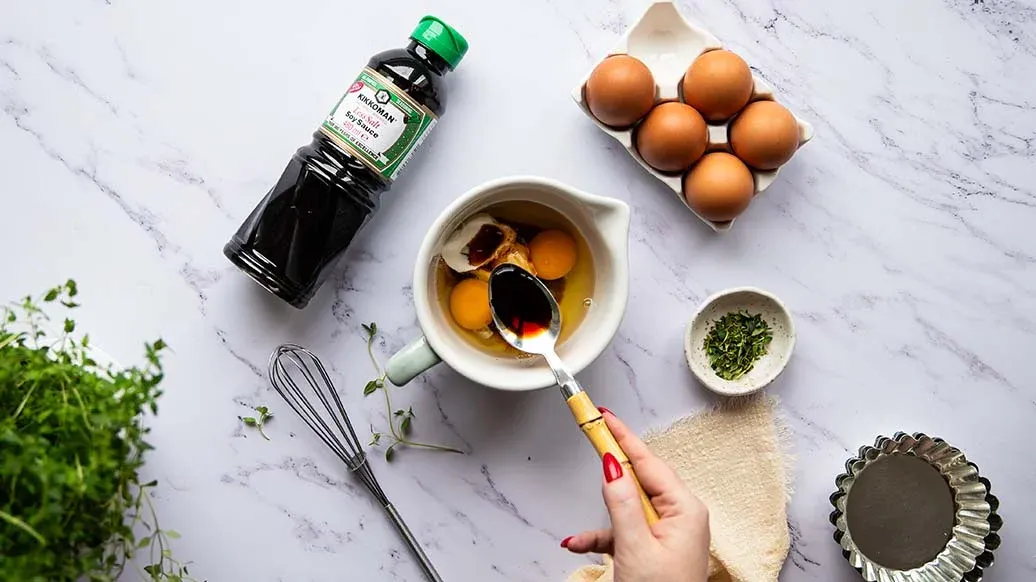 3 yumurta – 2 yemek kaşığı yoğurt – 2 yemek kaşığı Kikkoman Daha Az Tuzlu Doğal Olarak Fermente Soya Sosu – 2 tatlı kaşığı sriracha – 1 tatlı kaşığı doğranmış taze kekik